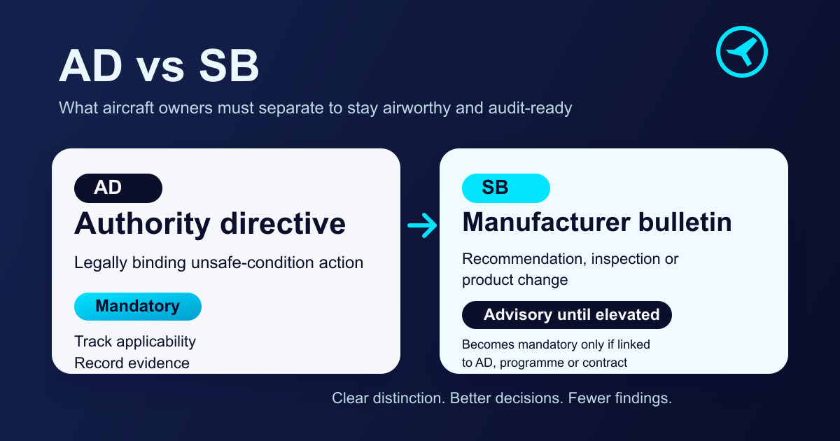 Owner ResponsibilityAudit & RiskClear explanation of Airworthiness Directives (AD) and Service Bulletins (SB), owner responsibility, when SB becomes mandatory, and audit risk.